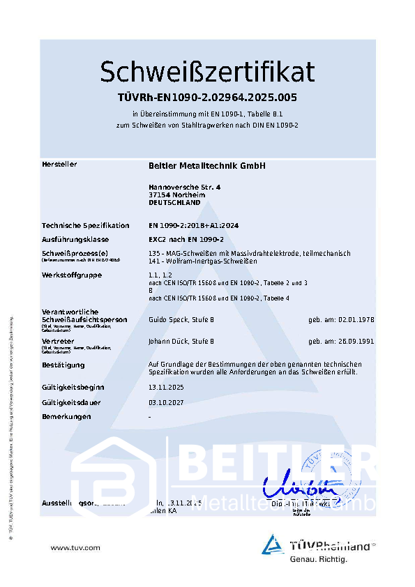 Als modernes Metallbau- und Schweißtechnikunternehmen steht die Beitler Metalltechnik GmbH für höchste Qualität, Sicherheit und geprüfte Leistungsstandards. Unsere Arbeit basiert auf klaren Strukturen, zertifizierten Prozessen und regelmäßigen Audits durch unabhängige Prüfstellen. Nachfolgend geben wir Ihnen einen Überblick über unsere wichtigsten Zertifikate.